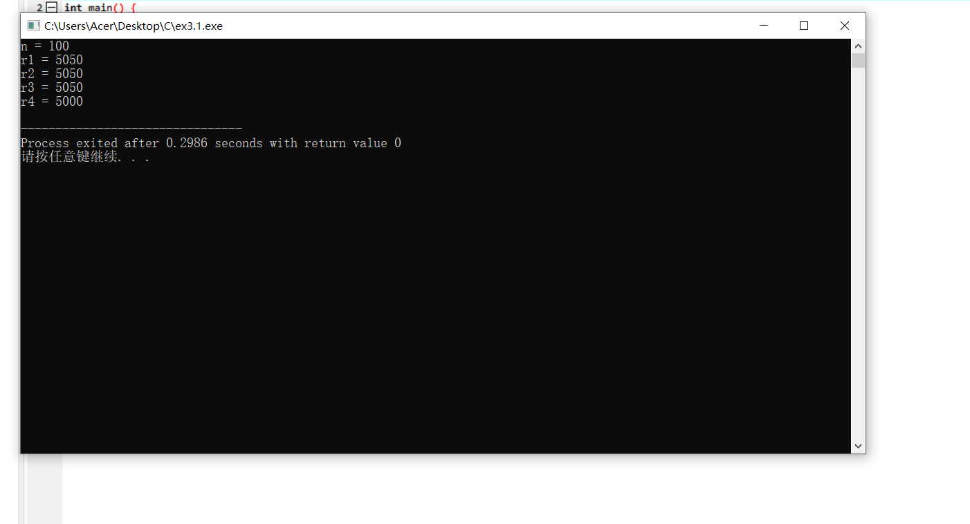 #include <stdio.h> int main() { int n, r1, r2, r3, r4; n = 101; r1 = n*(n+1)/2; r2 = (n+1)*n/2; r3 = n/2*(n+1); r4 = (n+1)/2*n; printf("n = %d\n", n); printf("r1 = %d\n", r1); printf("r2 = %d\n", r2); printf("r3 = %d\n", r3); printf("r4 = %d\n", r4); return 0; }