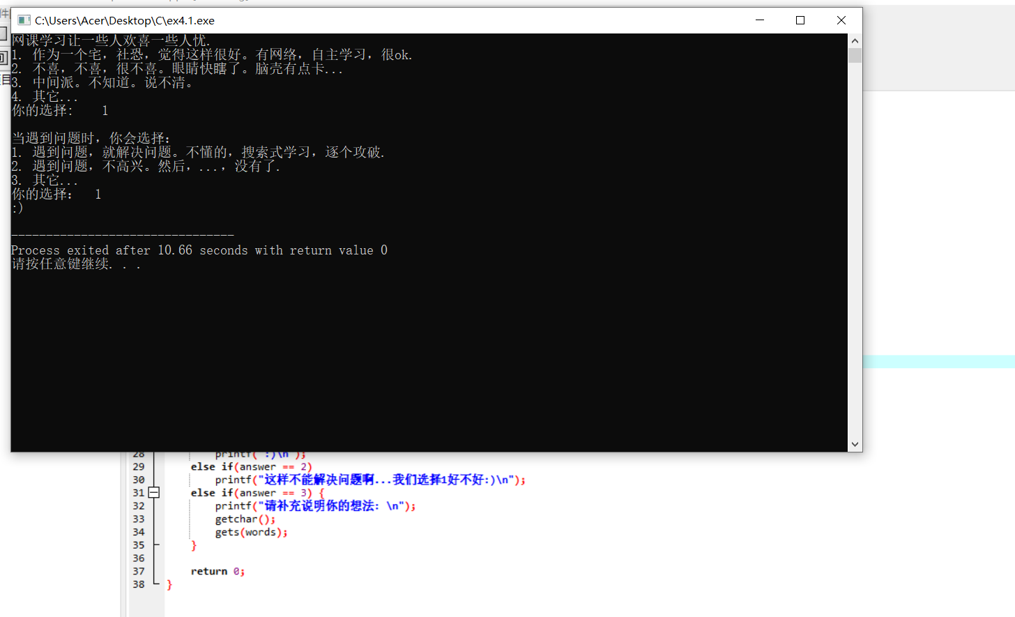 #include <stdio.h> int main() { int answer; char words[5000]; printf("网课学习让一些人欢喜一些人忧.\n"); printf("1. 作为一个宅,社恐,觉得这样很好。有网络,自主学习,很ok.\n"); printf("2. 不喜,不喜,很不喜。眼睛快瞎了。脑壳有点卡...\n"); printf("3. 中间派。不知道。说不清。\n"); printf("4. 其它...\n"); printf("你的选择: "); scanf("%d", &answer); if(answer == 4) { printf("请补充说明你的想法: \n"); getchar(); gets(words); } printf("\n"); printf("当遇到问题时,你会选择:\n"); printf("1. 遇到问题,就解决问题。不懂的,搜索式学习,逐个攻破.\n"); printf("2. 遇到问题,不高兴。然后,...,没有了.\n"); printf("3. 其它...\n"); printf("你的选择: "); scanf("%d", &answer); if(answer == 1) printf(":)\n"); else if(answer == 2) printf("这样不能解决问题啊...我们选择1好不好:)\n"); else if(answer == 3) { printf("请补充说明你的想法: \n"); getchar(); gets(words); } return 0; }