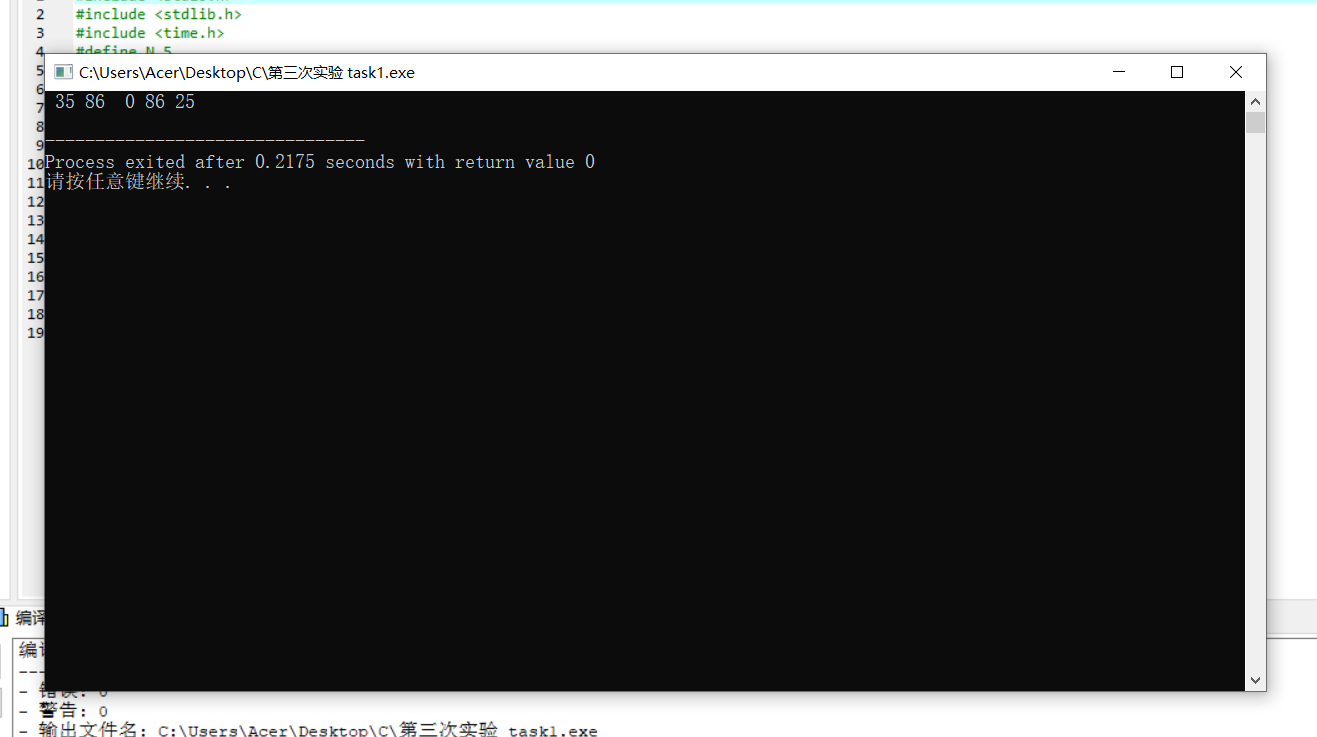 #include <stdio.h> #include <stdlib.h> #include <time.h> #define N 5 int main() { int x,n; srand(time(0)); for(n=1;n<=N;n++) { x = rand() % 32; printf("%3d",x); } printf("\n"); return 0; }