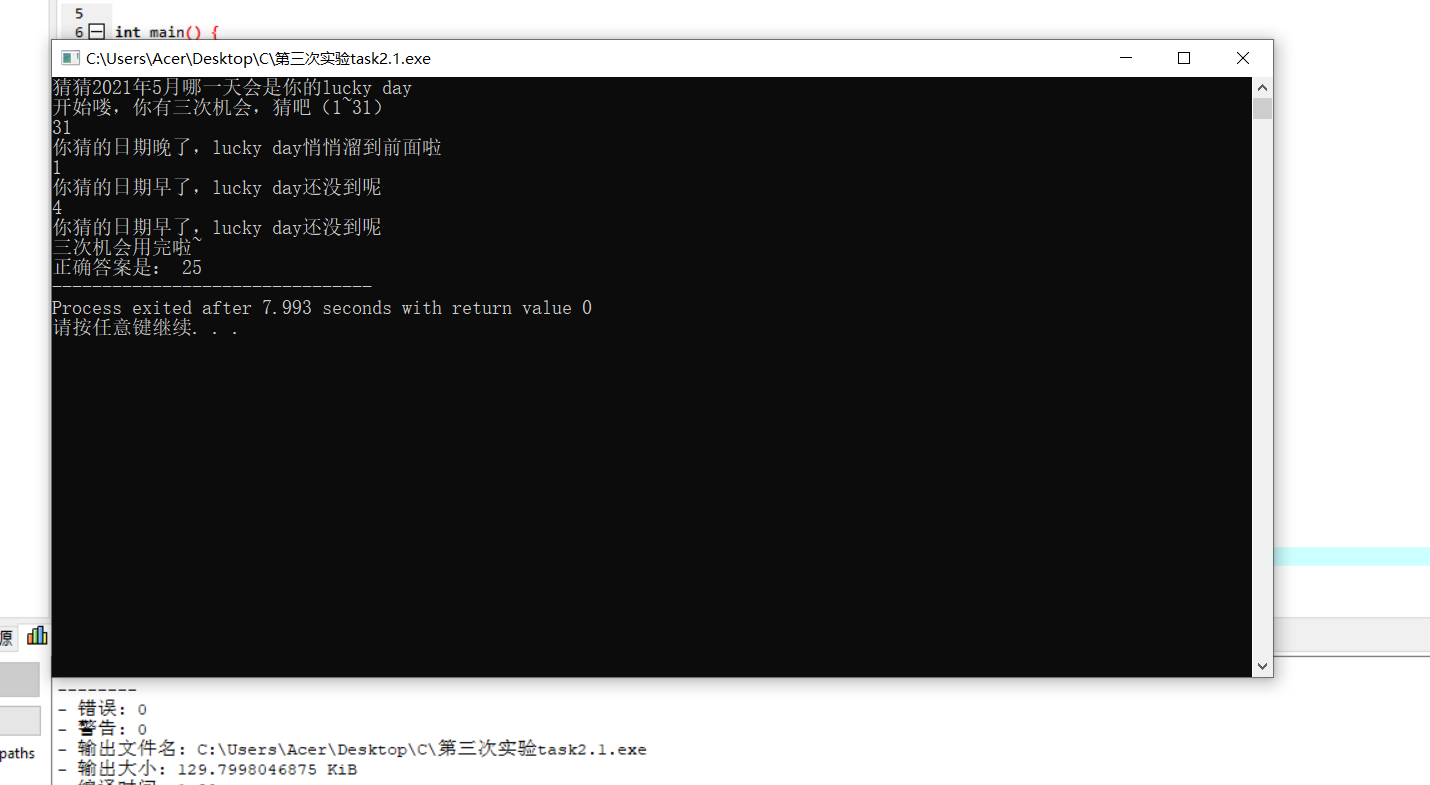 #include <stdio.h> #include <stdlib.h> #include <time.h> int main() { int x,n,a; srand(time(0)); x = rand() % 32; n=1; printf("猜猜2021年5月哪一天会是你的lucky day\n"); printf("开始喽,你有三次机会,猜吧(1~31)\n"); while(n<=3) { scanf("%d",&a); if(a==x) { return 0; } else if(a<x) { printf("你猜的日期早了,lucky day还没到呢\n"); } else if(a>x) { printf("你猜的日期晚了,lucky day悄悄溜到前面啦\n"); } else printf("非法输入\n"); n++; } printf("三次机会用完啦~\n正确答案是:"); printf("%3d",x); return 0; }
