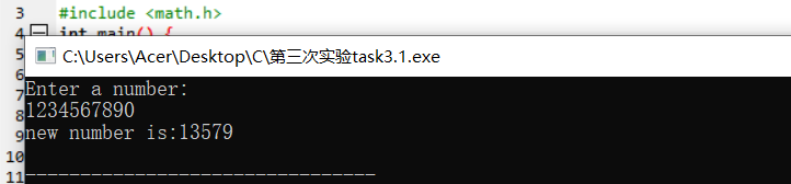 #include <stdio.h> #include <stdlib.h> #include <math.h> int main() { int n,m,t=0,a=1; printf("Enter a number:\n"); scanf("%d",&n); while(n!=0) { m=n%10; if(m%2!=0) { t=m*pow(10,(a-1))+t; a++; } n=n/10; } printf("new number is:%d\n",t); return 0; }