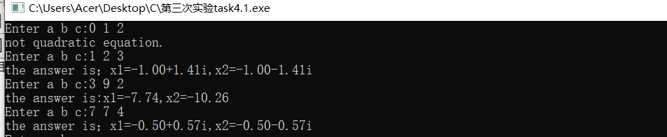 #include <stdio.h> #include <math.h> void solve(double a,double b,double c); int main() { double a,b,c; printf("Enter a b c:"); while(scanf("%lf%lf%lf",&a,&b,&c)!=EOF) { solve(a,b,c); printf("Enter a b c:"); } return 0; } void solve(double a,double b,double c) { double x1, x2; double delta,real,imag; if(a==0) { printf("not quadratic equation.\n"); } else{ delta=b*b-4*a*c; if(delta>=0) { x1=-b+sqrt(delta)/(2*a); x2=-b-sqrt(delta)/(2*a); printf("the answer is:x1=%.2f,x2=%.2f\n",x1,x2); } else{ real=-b/(2*a); imag=sqrt(-delta)/(2*a); printf("the answer is;x1=%.2f+%.2fi,x2=%.2f-%.2fi\n",real,imag,real,imag); } } }
