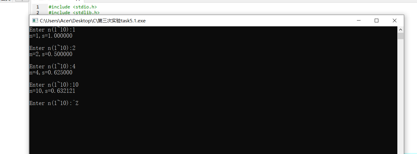 #include <stdio.h> #include <stdlib.h> #include <math.h> double fun(int n); int main() { int n; double s; printf("Enter n(1~10):"); while(scanf("%d",&n)!=EOF) { s=fun(n); printf("n=%d,s=%f\n\n",n,s); printf("Enter n(1~10):"); } return 0; } double fun(int n) { int i,p=1; double sum; for(i=1;i<=n;i++) { p=p*i; sum=1.0/(p*pow(-1,(i+1)))+sum; } return sum; }