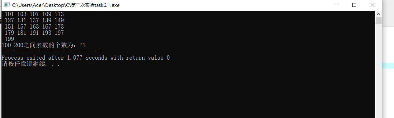 #include <stdio.h> #include <stdlib.h> #include <math.h> #define N 5 int isPrime(int n); int main() { int i,a,y=0; for(i=101;i<=200;i++) { if(isPrime(i)) { y++; printf("%4d",i); if(y%5==0) printf("\n"); } } printf("\n100-200之间素数的个数为:%d",y); return 0; } int isPrime(int n) { int k; for(k=2;k<=sqrt(n);k++) if(n%k==0) return 0; return 1; }