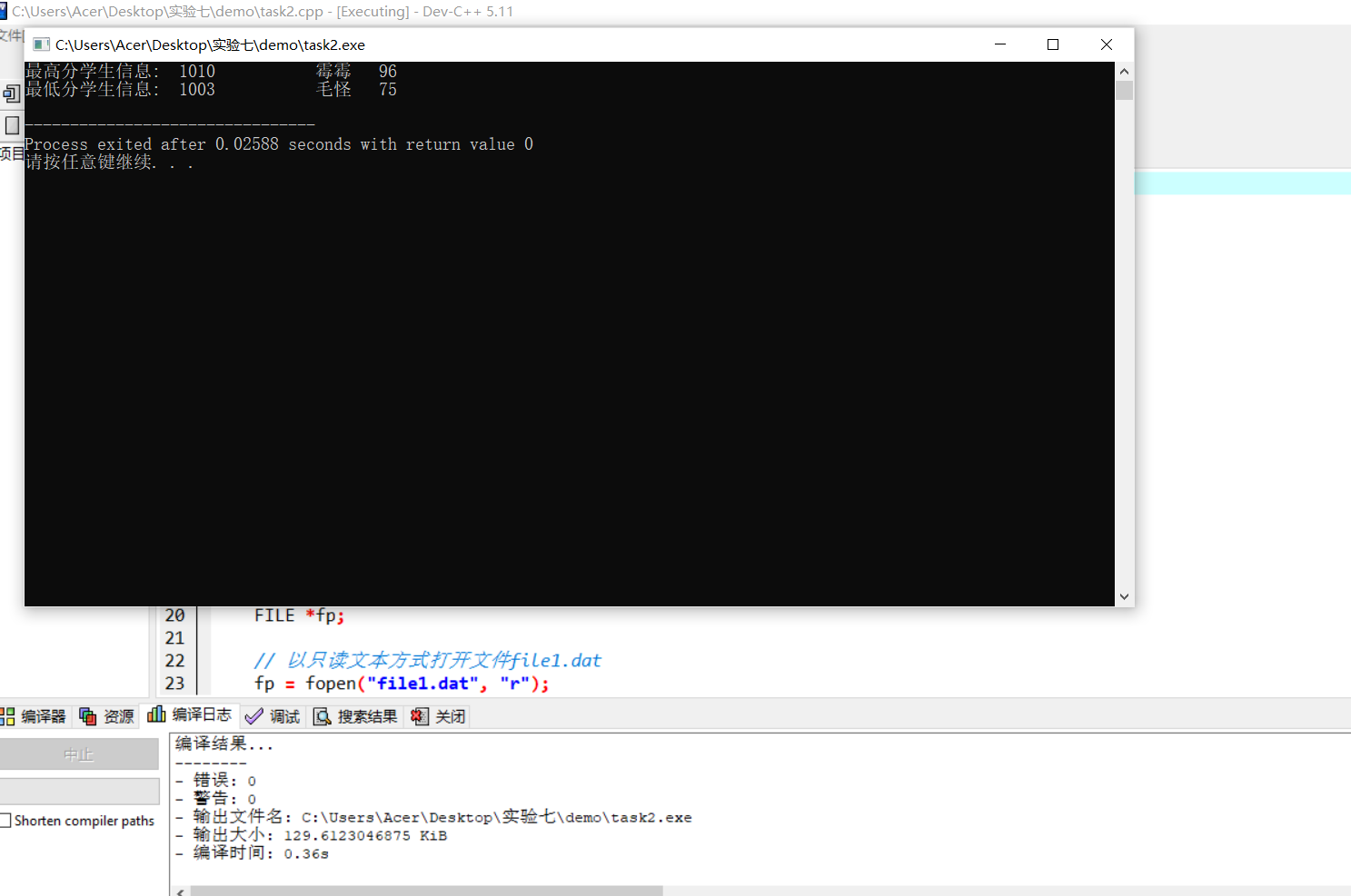 // 从文本文件file1.dat中读取数据,找出最高分和最低分学生信息,并输出在屏幕上 // 这是《C语言程序设计教程学习指导》「2.10 文件」中的实验,细微处做了微调 // 这个源代码没有考虑多个高分或多个低分的情形。 #include <stdio.h> #include <stdlib.h> #define N 10 // 定义一个结构体类型STU typedef struct student { int num; char name[20]; int score; }STU; int main() { STU st, stmax, stmin; int i; FILE *fp; // 以只读文本方式打开文件file1.dat fp = fopen("file1.dat", "r"); if( !fp ) { // 如果打开失败,则输出错误提示信息,然后退出程序 printf("fail to open file1.dat\n"); exit(0); } stmax.score = 0; // 先假定最高分是0,后面如发现比当前最高分还高的分数,就更新最高分 stmin.score = 100; // 先假定最低分是100分,后面如发现比当前最低分更低的分数,就更新最低分 for(i=0; i<N; i++) { fscanf(fp, "%d %s %d", &st.num, st.name, &st.score); // 从fp指定的文件中格式化读取一个学生信息 if(st.score > stmax.score) stmax = st; else if(st.score < stmin.score) stmin = st; } fclose(fp); printf("最高分学生信息: %5d%15s%5d\n", stmax.num, stmax.name, stmax.score); printf("最低分学生信息: %5d%15s%5d\n", stmin.num, stmin.name, stmin.score); return 0; }