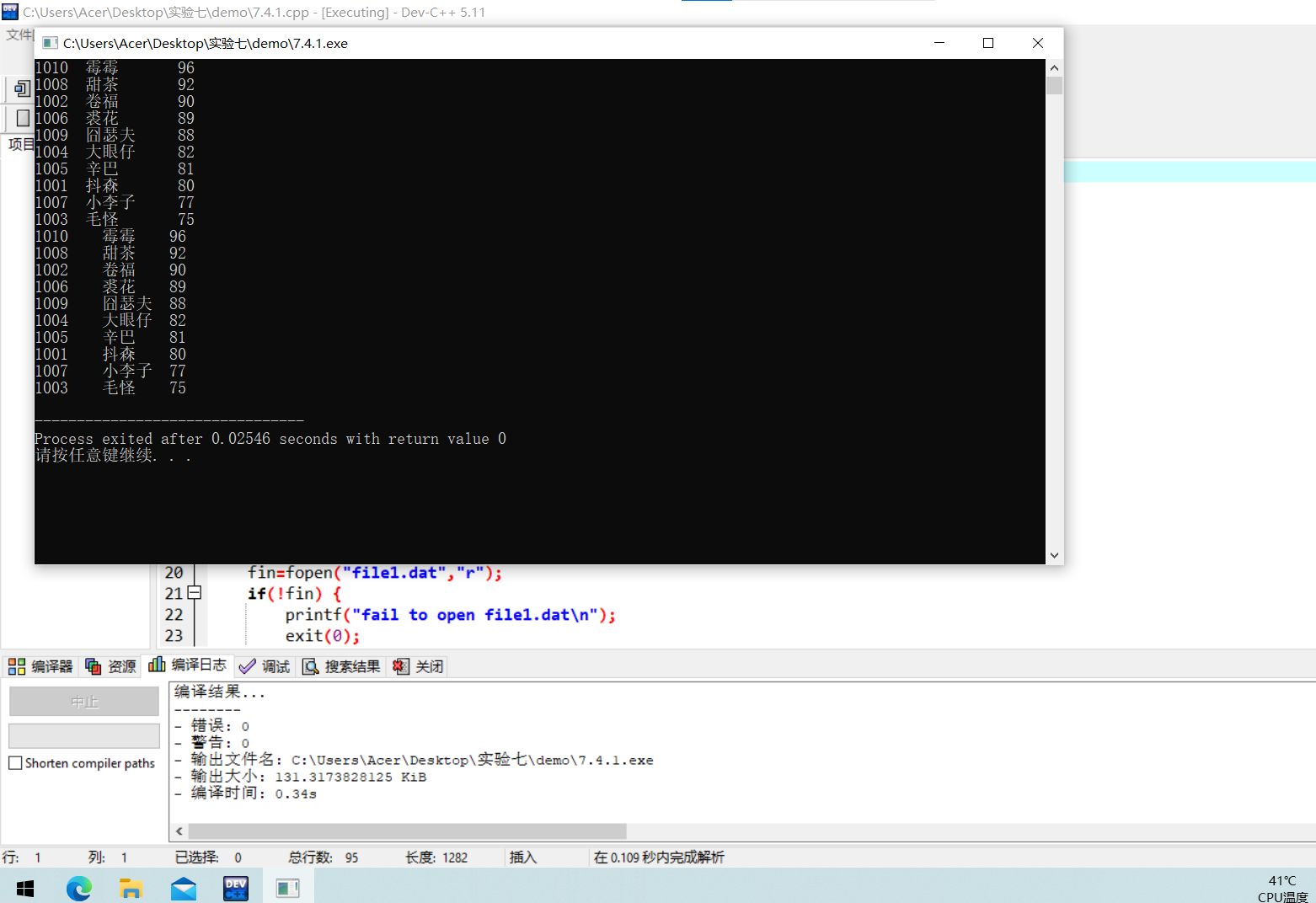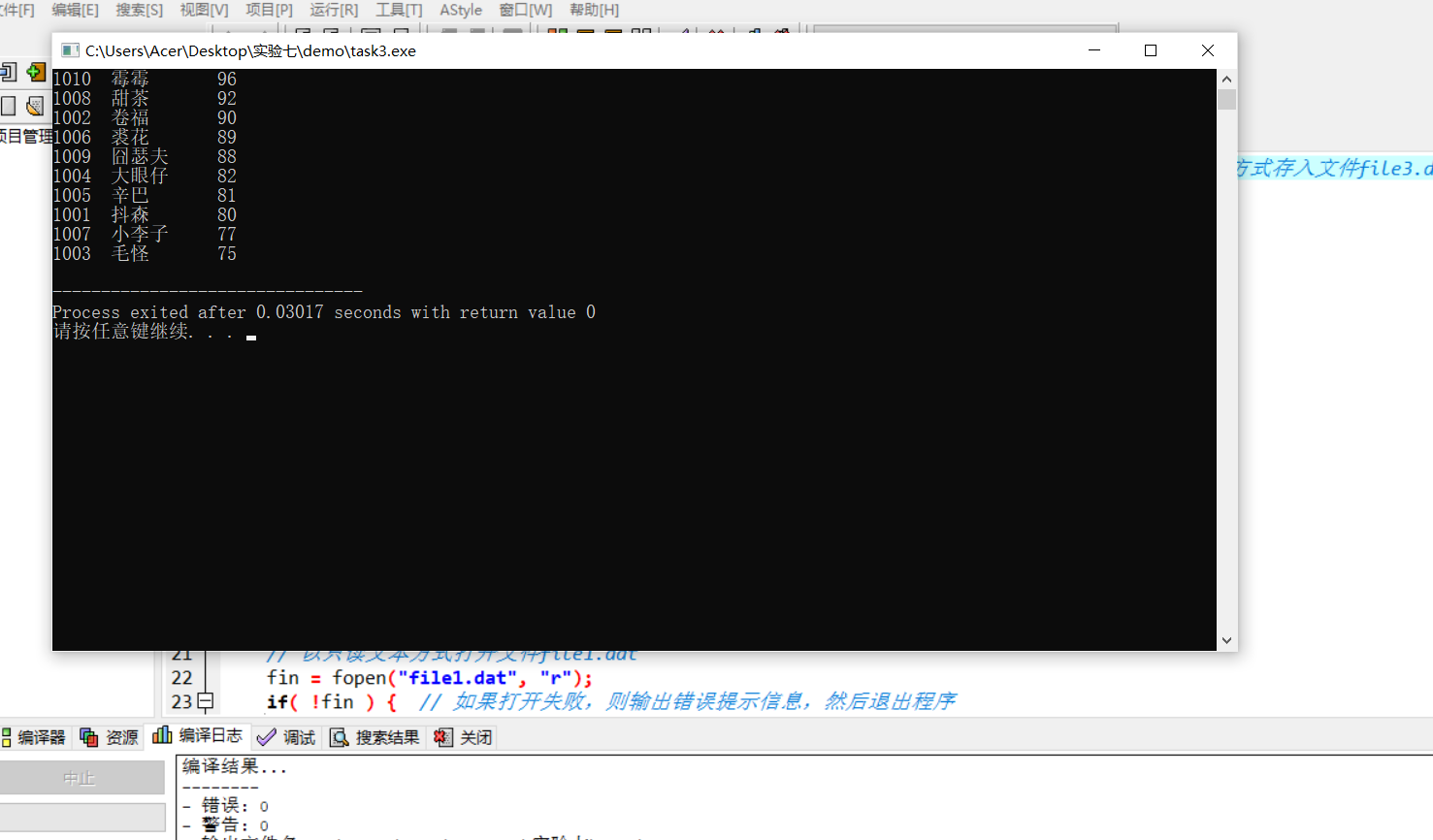 #include <stdio.h> #include <stdlib.h> #include <string.h> #define N 10 typedef struct student { int num; char name[20]; int score; }STU; void sort(STU *pst,int n); void open(); int main() { FILE *fin,*fout; STU st[N]; int i; fin=fopen("file1.dat","r"); if(!fin) { printf("fail to open file1.dat\n"); exit(0); } for(i=0;i<N;i++) fscanf(fin,"%d %s %d",&st[i].num,st[i].name,&st[i].score); fclose(fin); sort(st,N); fout=fopen("file4.dat","wb"); if(!fout) { printf("fail to open file1.dat\n"); exit(0); } for(i=0;i<N;i++) printf("%-6d%-10s%3d\n",st[i].num,st[i].name,st[i].score); fwrite(st,sizeof(STU),N,fout); fclose(fout); FILE *fp; fp = fopen("file4.dat", "rb"); if(fp == NULL) { printf("fail to open file4.dat\n"); exit(0); } fread(st, sizeof(STU), N, fp); for(i=0; i<N; i++) printf("%d\t%s\t%d\n", st[i].num, st[i].name, st[i].score); fclose(fp); return 0; } void sort(STU *pst,int n) { STU *pi,*pj,t; for(pi=pst;pi<pst+n-1;pi++) for(pj=pi+1;pj<pst+n;pj++) if(pi->score<pj->score) { t=*pi; *pi=*pj; *pj=t; } }
