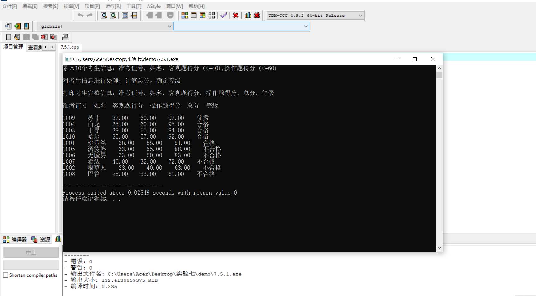 #include <stdio.h> #include <string.h> #include <stdlib.h> const int N = 10; typedef struct student { long int id; char name[20]; float objective; float subjective; float sum; char level[10]; }STU; void input(STU s[],int n); void output(STU s[],int n); void process(STU s[],int n); int main() { STU stu[N]; printf("录入%d个考生信息:准考证号,姓名,客观题得分(<=40),操作题得分(<=60)\n",N); input(stu,N); printf("\n对考生信息进行处理:计算总分,确定等级\n"); process(stu,N); printf("\n打印考生完整信息:准考证号,姓名,客观题得分,操作题得分,总分,等级\n"); output(stu,N); return 0; } void input(STU s[],int n) { FILE *fp; fp = fopen("examinee.txt","r"); if(!fp) { printf("fail to open examinee.txt\n"); exit(0); } int i; for(i=0;i<N;i++) { fscanf(fp,"%ld %s %f %f",&s[i].id,&s[i].name,&s[i].objective,&s[i].subjective); } fclose(fp); } void output(STU s[],int n) { int i; FILE *fp; fp=fopen("result.txt","w"); if(fp==NULL) { printf("fail to open result.txt\n"); exit(0); } printf("\n"); printf("准考证号 姓名 客观题得分 操作题得分 总分 等级\n"); printf("\n"); for(i=0;i<N;i++) { printf("%ld %s %.2f %.2f %.2f %s\n",s[i].id,s[i].name,s[i].objective,s[i].subjective,s[i].sum,s[i].level); fprintf(fp,"%ld %s %.2f %.2f %.2f %s\n",s[i].id,s[i].name,s[i].objective,s[i].subjective,s[i].sum,s[i].level); } fclose(fp); } void process(STU s[],int n) { int i,j=0; STU temp; for(i=0;i<n;i++) { s[i].sum=s[i].objective+s[i].subjective; } for(i=0;i<n-1;i++) for(j=0;j<n-1-i;j++) if(s[j].sum<s[j+1].sum) { temp=s[j]; s[j]=s[j+1]; s[j+1]=temp; } for(i=0;i<n;i++) { if(i<=(n*0.1-1)) strcpy(s[i].level,"优秀"); else if(i>(n*0.1-1)&&i<=(n*0.5-1)) { strcpy(s[i].level,"合格"); } else { strcpy(s[i].level,"不合格"); } } }