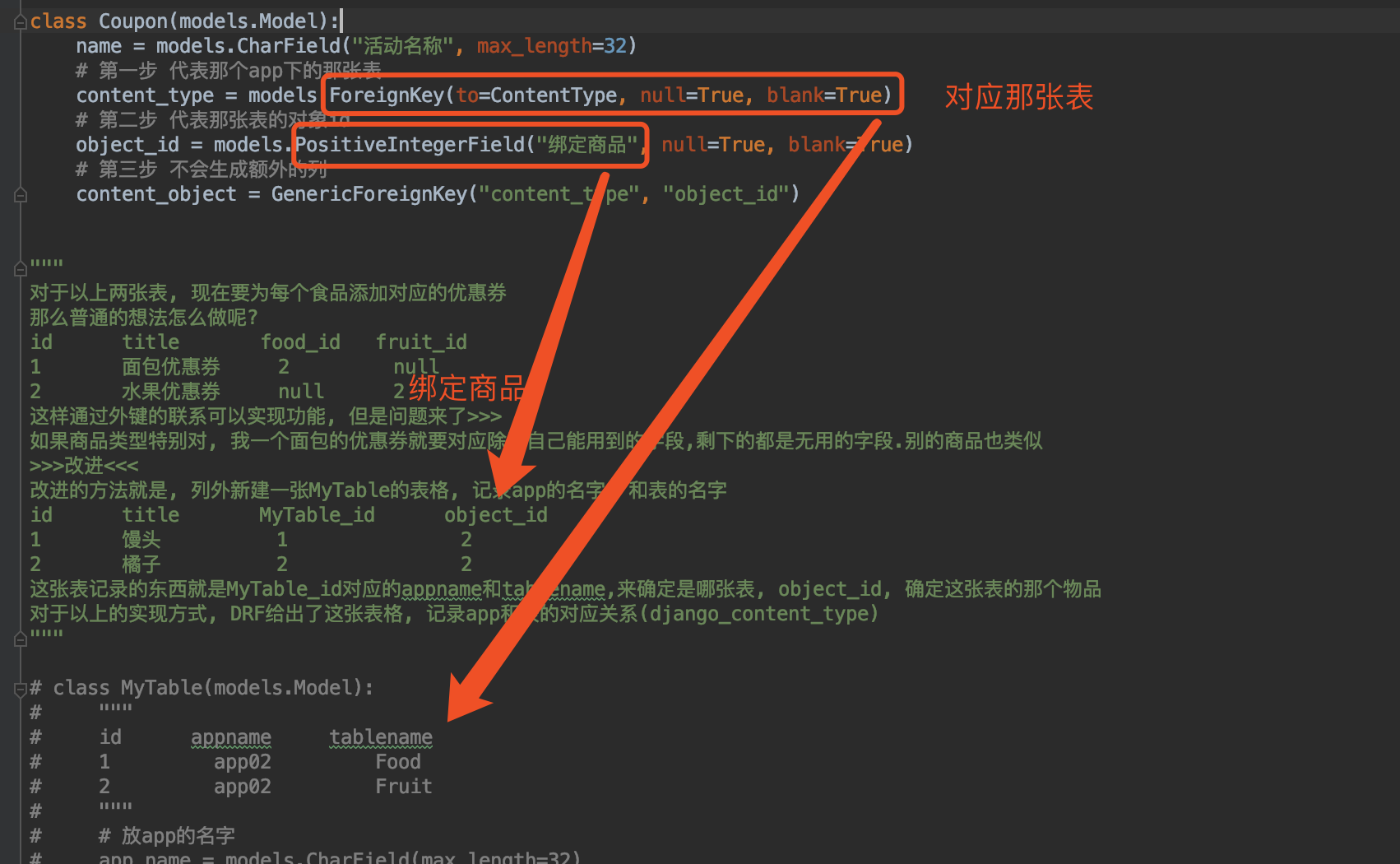 - 在model中定义ForeignKey字段, 并关联到ContentType表, 通常这个字段命名为content-type