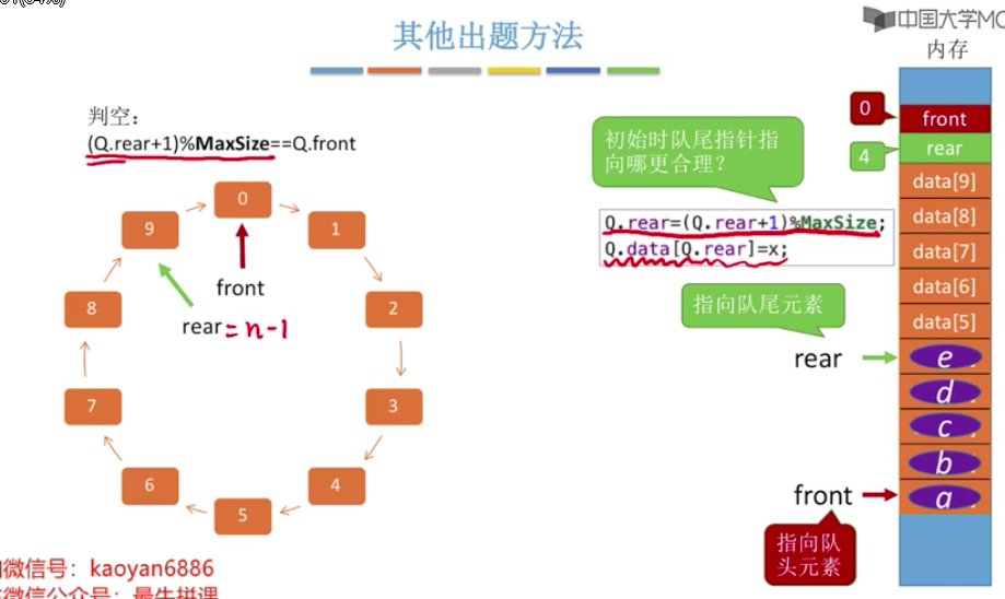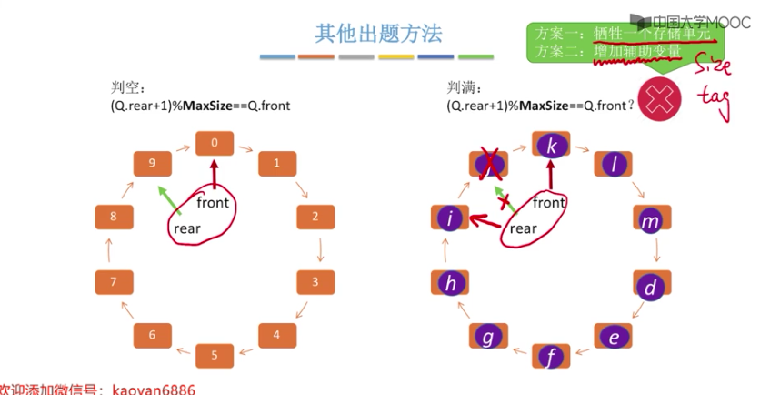 //记住如下内容 # 队列元素个数 (rear+MaxSize-front)%MaxSize # 以下内容都是: 指向队尾元素的后一个位置(下一个应该是插入位置) //方案一 : 判断队列已满/已空(浪费空间,其他的2,3方案都不浪费) #define MaxSize 10 //定义队列中元素的最大个数 typedef struct{ ElemType data[MaxSize]; //用静态数组存放队列元素 int front , rear; // 队头指针和对尾指针 // 初始化时 front rear 都是为0 }SqQueue; # 队列已满的条件: 队尾指针的再下一个位置是队头 (Q.rear+1)%MaxSize == Q.front # 队空条件 Q.rear == Q.front //方案二 : 判断队列已满/已空 #define MaxSize 10 //定义队列中元素的最大个数 typedef struct{ ElemType data[MaxSize]; //用静态数组存放队列元素 int front , rear; // 队头指针和对尾指针 int size; // 队列当前长度 // 初始化时 front rear size 都是为0 }SqQueue; # 插入成功 size++ # 删除成功 size-- # 队满条件 size==MaxSize #队空条件 size==0 //方案三 : 判断队列已满/已空 #define MaxSize 10 //定义队列中元素的最大个数 typedef struct{ ElemType data[MaxSize]; //用静态数组存放队列元素 int front , rear; // 队头指针和对尾指针 int tag; // 最近进行的是删除/插入 // 初始化时 front=rear=0 tag=0 }SqQueue; #每次删除操作成功时,都令tag=0; #每次插入操作成功时,都令tag=1; //只有删除操作,才可能导致队空 # 队空条件 front==rear && tag==0 //只有插入操作,才可能导致队满 # 队满条件 front==rear && tag==1