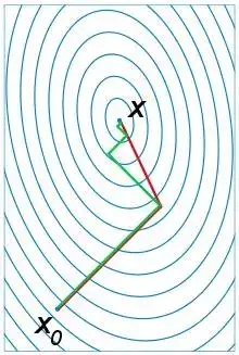 下图为共轭梯度法和梯度下降法搜索最优解的路径对比示意图: