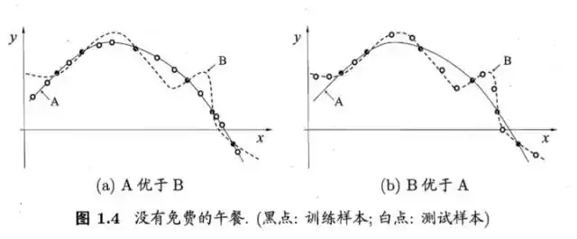 没有免费的午餐定理: 对于训练样本(黑点),不同的算法A/B在不同的测试样本(白点)中有不同的表现,这表示:对于一个学习算法A,若它在某些问题上比学习算法 B更好,则必然存在一些问题,在那里B比A好。