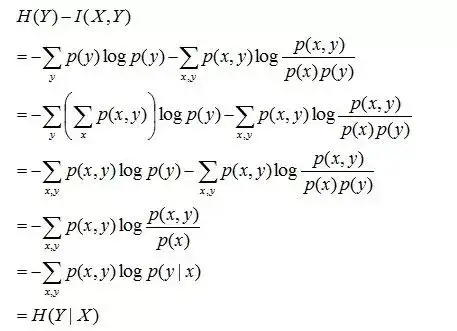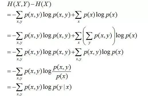 且有此式子成立:H(Y|X) = H(X,Y) – H(X),整个式子表示(X,Y)发生所包含的熵减去X单独发生包含的熵。至于怎么得来的请看推导: