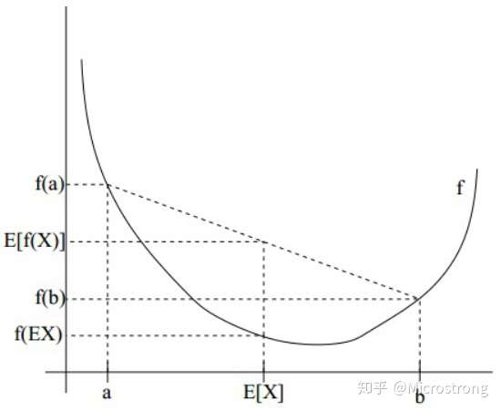 图2中,实线f表示凸函数,X是随机变量,有0.5的概率是a,有0.5的概率是b。X的期望值就是a和b的中值,从图中可以看到 成立。