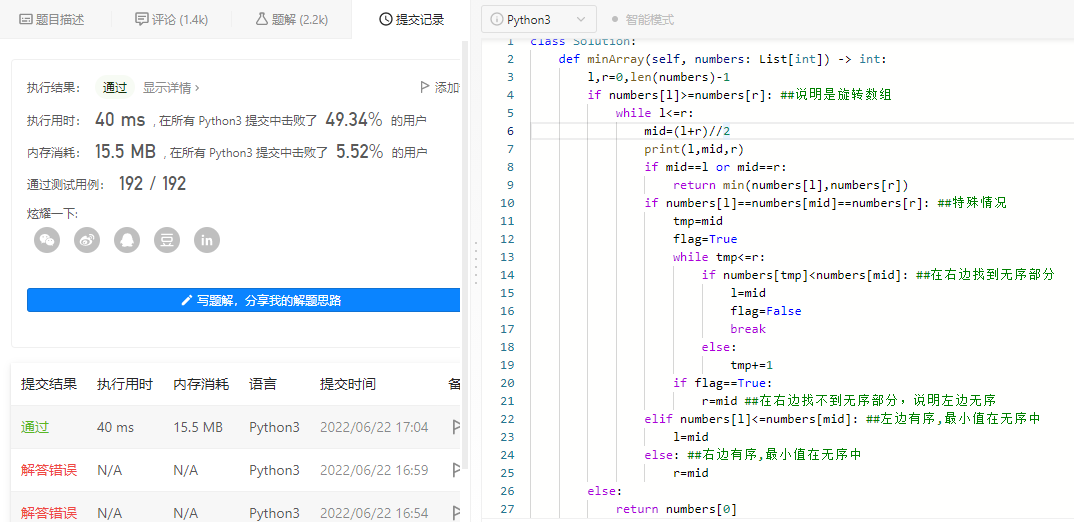 思路:旋转点就是最小值,肯定在无序的那一边,特殊情况numbers[l]==numbers[mid]==numbers[r],在右边遍历,看能不能找到无序部分,不能的话说明左边无序
