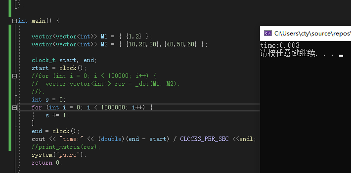 矩阵运算:循环10w次,python调用的numpy(底层为c,且经过大牛们高度优化) 是c++自己写的vector二维数组的20倍(限于初学c++,写的也许性能不好,但是numpy的威力可见一斑,混合编程时使用numpy!)
