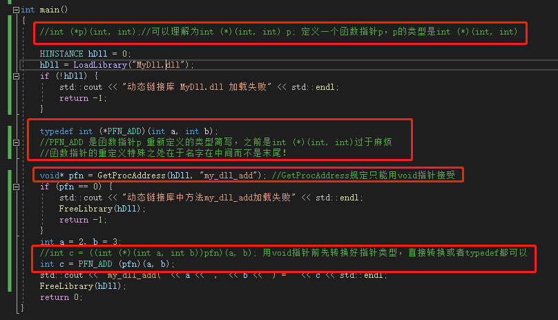 void* pfn = GetProcAddress(hDll, "my_dll_add"); //GetProcAddress规定只能用void指针接受