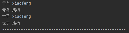 from itertools import product e = {'青鸟':'最美','世子':'纨绔'} j = {'xiaofeng':'1','废物':'2'}#对字典获取多个无穷循环器的笛卡尔积 for i,j in product(e,j): print (i,j) #字典只对键进行笛卡尔积交换 print ('-----------------------------------------------------')