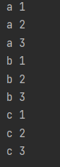 from itertools import product a = ['a','b','c'] b = [1,2,3] for i ,j in product(a,b): #对列表获取多个无穷循环器的笛卡尔积 print (i,j) print ('-----------------------------------------------------')