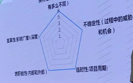 通过对项目进行画像,在独特性、变革性、不确定性、跨职能性、临时性,5个维度上对项目进行打分,来得出这个项目的可行性,是更偏重人还是事,最后我嫩会对项目有一个清晰的认知。