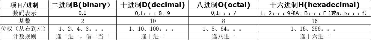 十进制D(decimal)、二进制B(binary)、八进制O(octal)、十六进制H(hexadecimal)