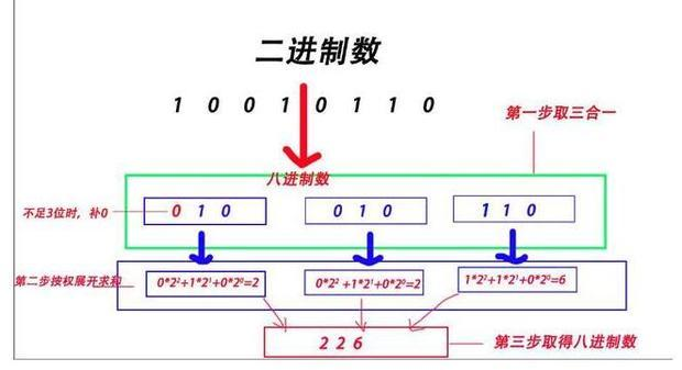 二进制数:10010110B=010,010,110B=226o,即八进制数是226