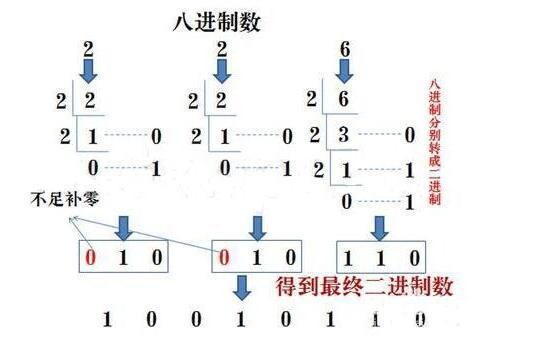 转换方法:八进制数通过除2取余法,得到二进制数,对每个八进制为3个二进制,不足时在最左边补零。