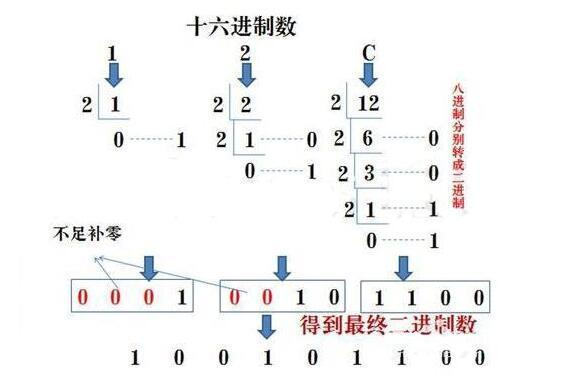 转换方法:十六进制数通过除2取余法,得到二进制数,对每个十六进制为4个二进制,不足时在最左边补零。