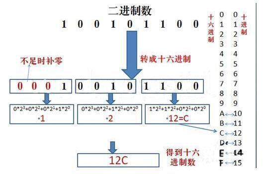 转换方法:与二进制转八进制方法近似,八进制是取三合一,十六进制是取四合一。(注意事项,4位二进制转成十六进制是从右到左开始转换,不足时补0)