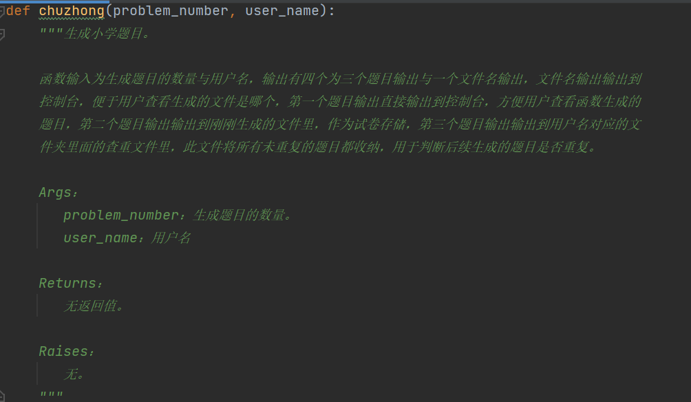 可以看到队友在对于项目所定义的函数都有较为详细的注释的描述,比如下面的生成初中题目的方法,队友按照python的编程规范对于所定义的方法的功能,参数以及返回值做了规范的描述,这是值得提倡的一个优点。