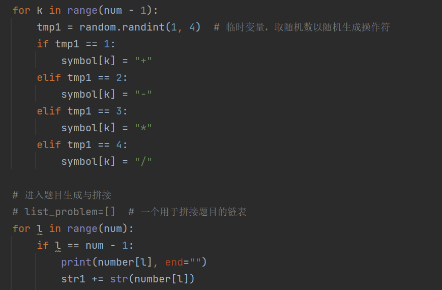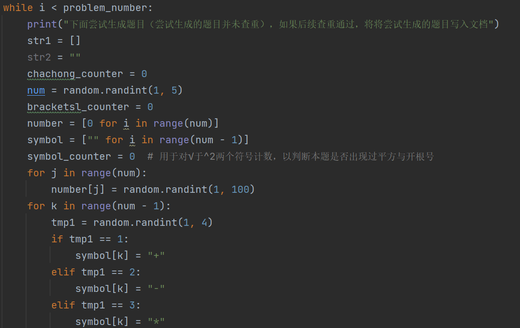 队友采用python实现,所有功能均在一个python文件中完成,程序主要在一个while循环里面调用我们生成题目的功能,首先进行登录判断,如果登录成功,则在根据用户依靠提示的输入进行对生成不同类型的题目的调用。