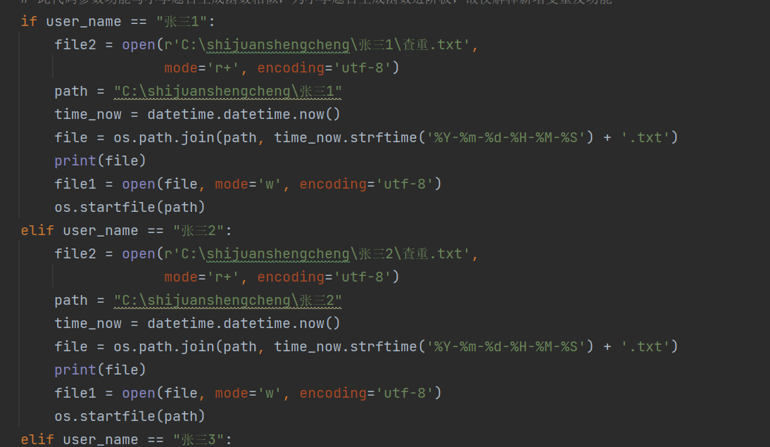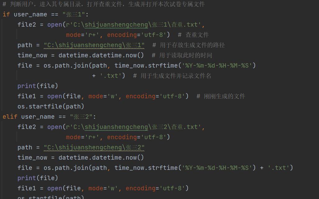 可以看到作者在xiaoxue,chuzhong,gaozhong,三个方法中都用到了文件写操作,但是对于文件的写入,作者是对当前的用户名进行逐一的判断,进而生成对应的文件夹,并未很好的用到作者定义到了类Zhanghu,其实我们这里可以利用字符串拼接的方法将当前用户的用户名和文件路径拼接起来,以及将文件写入对应的文件夹构建成一个方法,这样就避免了对于当前用户的逐一判断,即可减少代码量,又提高了代码的可读性。