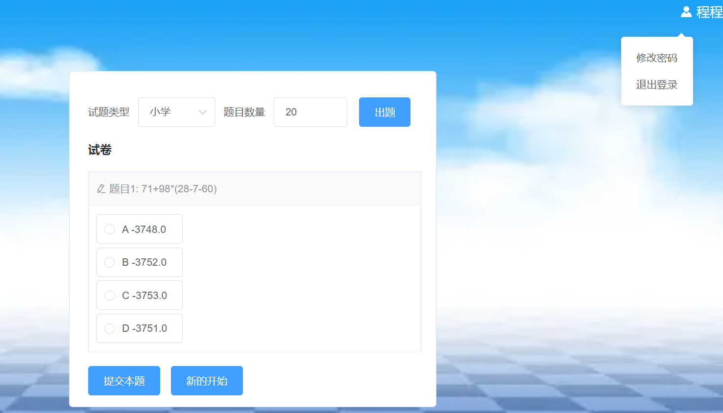 本次结对编程的项目由我(陈熠玮)和吴依凡同学完成。前端采用的是vue+ajax+elementui,后端采用的是Spring Boot,我主要负责后端代码的编写。吴依凡同学个人项目采用的是python实现,为了给后续团队项目进行积累,我们于是采用ava语言,出题的逻辑主要复用的我的代码。
