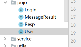 pojo里面是一些实体类,Resp是传送前端和后端数据的实体,user是定义的用户,MessageResult是前端后端校验验证码的实体,Login是将用户登录时的数据存储的实体。