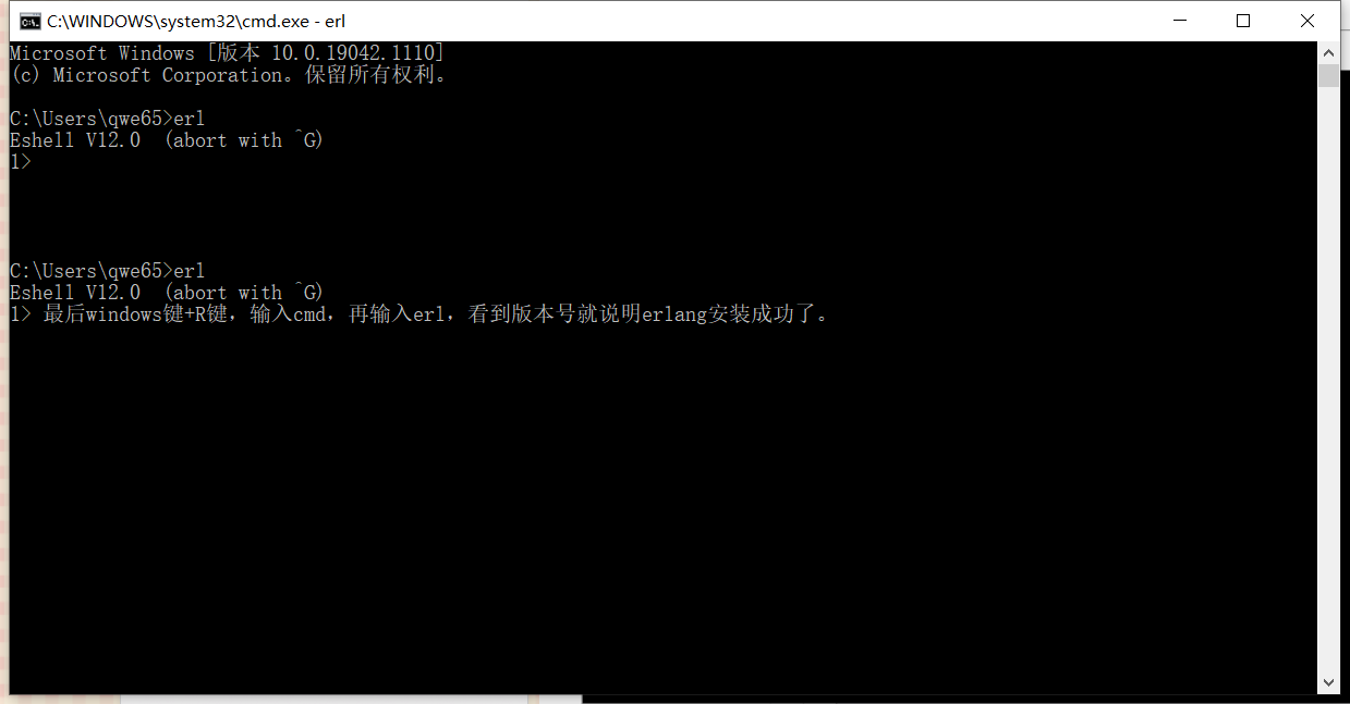 最后windows键+R键,输入cmd,再输入erl,看到版本号就说明erlang安装成功了。