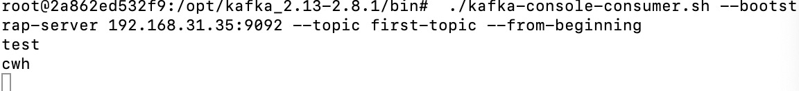 另起一个终端,进入 kafka 容器,进入/opt/kafka_2.12-2.5.0/bin目录,运行 kafka 消费者接收消息