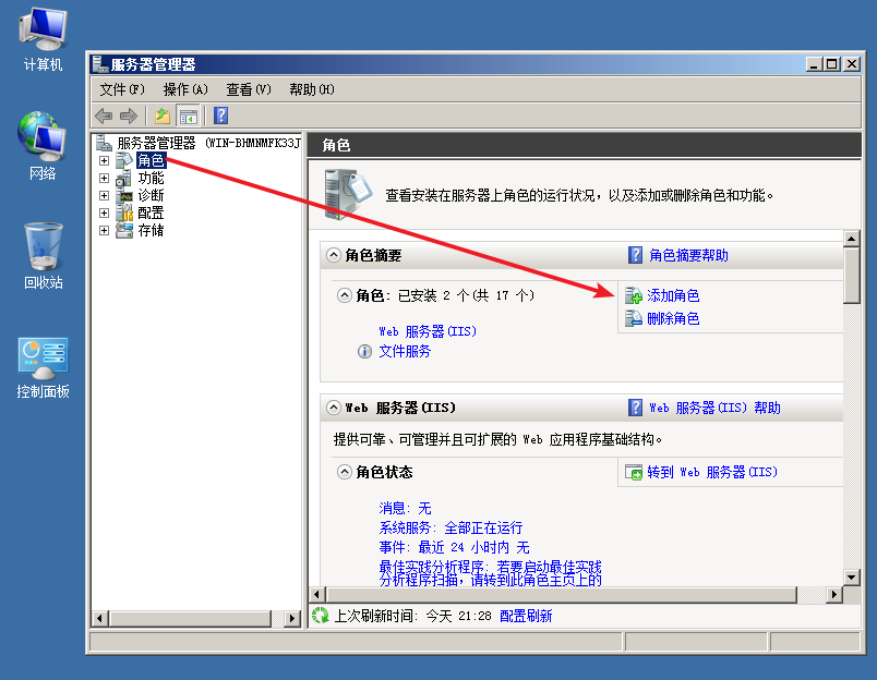 计算机 -> 右键 -> 管理 -> 角色-> 添加角色