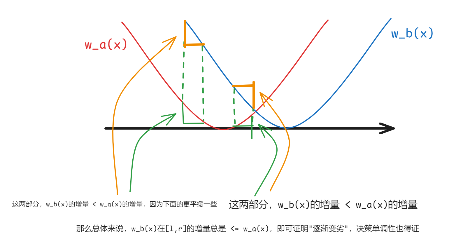 那么对于决策点 \(j_1<j_2\),存在一个分界点 \(x>j_2\),使得 \(j_2<i<x\) 的决策点由 \(j_1\) 转移,\(i\ge x\) 的决策点由 \(j_2\) 转移。