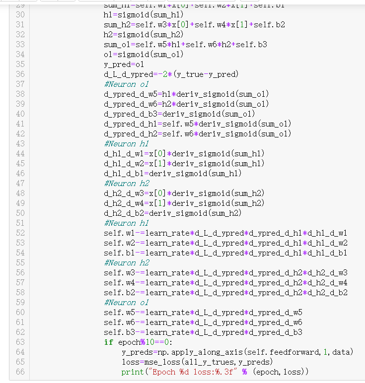 def sigmoid(x): return 1/(1+np.exp(-x))#f(x)=1/(1+exp(-x)) def deriv_sigmoid(x): fx=sigmoid(x) return fx*(1-fx)#f'(x)=f(x)*(1-f(x)) def mse_loss(y_true,y_pred): return ((y_true-y_pred)**2).mean() class OurNeuralNetwork: def __init__(self): self.w1=np.random.normal()#权重 self.w2=np.random.normal() self.w3=np.random.normal() self.w4=np.random.normal() self.w5=np.random.normal() self.w6=np.random.normal() self.b1=np.random.normal()#截距项 self.b2=np.random.normal() self.b3=np.random.normal() def feedforward(self,x): h1=sigmoid(self.w1*x[0]+self.w2*x[1]+self.b1) h2=sigmoid(self.w3*x[0]+self.w4*x[1]+self.b2) o1=sigmoid(self.w5*h1+self.w6*h2+self.b3) return o1 def train(self,data,all_y_trues): learn_rate=0.1 epochs=1000 for epoch in range(epochs): for x,y_true in zip(data,all_y_trues): sum_h1=self.w1*x[0]+self.w2*x[1]+self.b1 h1=sigmoid(sum_h1) sum_h2=self.w3*x[0]+self.w4*x[1]+self.b2 h2=sigmoid(sum_h2) sum_o1=self.w5*h1+self.w6*h2+self.b3 o1=sigmoid(sum_o1) y_pred=o1 d_L_d_ypred=-2*(y_true-y_pred) #Neuron o1 d_ypred_d_w5=h1*deriv_sigmoid(sum_o1) d_ypred_d_w6=h2*deriv_sigmoid(sum_o1) d_ypred_d_b3=deriv_sigmoid(sum_o1) d_ypred_d_h1=self.w5*deriv_sigmoid(sum_o1) d_ypred_d_h2=self.w6*deriv_sigmoid(sum_o1) #Neuron h1 d_h1_d_w1=x[0]*deriv_sigmoid(sum_h1) d_h1_d_w2=x[1]*deriv_sigmoid(sum_h1) d_h1_d_b1=deriv_sigmoid(sum_h1) #Neuron h2 d_h2_d_w3=x[0]*deriv_sigmoid(sum_h2) d_h2_d_w4=x[1]*deriv_sigmoid(sum_h2) d_h2_d_b2=deriv_sigmoid(sum_h2) #Neuron h1 self.w1-=learn_rate*d_L_d_ypred*d_ypred_d_h1*d_h1_d_w1 self.w2-=learn_rate*d_L_d_ypred*d_ypred_d_h1*d_h1_d_w2 self.b1-=learn_rate*d_L_d_ypred*d_ypred_d_h1*d_h1_d_b1 #Neuron h2 self.w3-=learn_rate*d_L_d_ypred*d_ypred_d_h2*d_h2_d_w3 self.w4-=learn_rate*d_L_d_ypred*d_ypred_d_h2*d_h2_d_w4 self.b2-=learn_rate*d_L_d_ypred*d_ypred_d_h2*d_h2_d_b2 #Neuron o1 self.w5-=learn_rate*d_L_d_ypred*d_ypred_d_w5 self.w6-=learn_rate*d_L_d_ypred*d_ypred_d_w6 self.b3-=learn_rate*d_L_d_ypred*d_ypred_d_b3 if epoch%10==0: y_preds=np.apply_along_axis(self.feedforward,1,data) loss=mse_loss(all_y_trues,y_preds) print("Epoch %d loss:%.3f" % (epoch,loss))