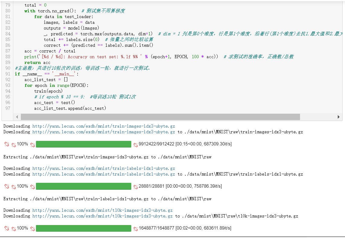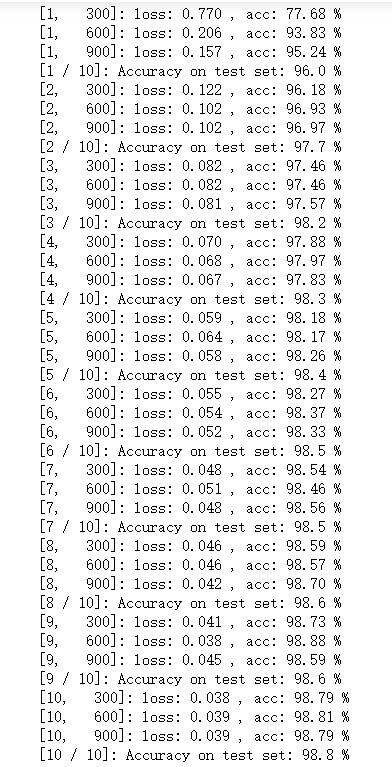 #超参数:用到的超参数主要有小批量数据的batch size, #梯度下降算法中用到的学习率(learning rate)和冲量(momentum),同时定义进行10轮次的训练。 batch_size = 64 learning_rate = 0.01 momentum = 0.5 EPOCH = 10 # softmax归一化指数函数,其中0.1307是mean均值和0.3081是std标准差 transform = transforms.Compose([transforms.ToTensor(), transforms.Normalize((0.1307,), (0.3081,))]) #下载/获取数据集,其中root为数据集存放路径,train=True即训练集否则为测试集。 train_dataset = datasets.MNIST(root='./data/mnist', train=True, transform=transform, download=True) # 本地没有就加上download=True test_dataset = datasets.MNIST(root='./data/mnist', train=False, transform=transform, download=True) # train=True训练集,=False测试集 #实例化一个dataset后,然后用Dataloader 包起来,即载入数据集 #shuffle=True即打乱数据集,这里我们打乱训练集进行训练,而对测试集进行顺序测试。 train_loader = DataLoader(train_dataset, batch_size=batch_size, shuffle=True) test_loader = DataLoader(test_dataset, batch_size=batch_size, shuffle=False) # 训练集乱序,测试集有序 class Net(torch.nn.Module): def __init__(self): super(Net, self).__init__() self.conv1 = torch.nn.Sequential( torch.nn.Conv2d(1, 10, kernel_size=5), torch.nn.ReLU(), torch.nn.MaxPool2d(kernel_size=2), ) self.conv2 = torch.nn.Sequential( torch.nn.Conv2d(10, 20, kernel_size=5), torch.nn.ReLU(), torch.nn.MaxPool2d(kernel_size=2), ) self.fc = torch.nn.Sequential( torch.nn.Linear(320, 50), torch.nn.Linear(50, 10), ) def forward(self, x): batch_size = x.size(0) x = self.conv1(x) # 一层卷积层,一层池化层,一层激活层(图是先卷积后激活再池化,差别不大) x = self.conv2(x) # 再来一次 x = x.view(batch_size, -1) # flatten 变成全连接网络需要的输入 (batch, 20,4,4) ==> (batch,320), -1 此处自动算出的是320 x = self.fc(x) return x # 最后输出的是维度为10的,也就是(对应数学符号的0~9) #实例化模型 model = Net() #损失函数使用交叉熵损失 #参数优化使用随机梯度下降 criterion = torch.nn.CrossEntropyLoss() # 交叉熵损失 optimizer = torch.optim.SGD(model.parameters(), lr=learning_rate, momentum=momentum) # lr学习率,momentum冲量 # 把单独的一轮一环封装在函数类里 #训练轮 def train(epoch): running_loss = 0.0 # 这整个epoch的loss清零 running_total = 0 running_correct = 0 for batch_idx, data in enumerate(train_loader, 0): inputs, target = data optimizer.zero_grad() # forward + backward + update outputs = model(inputs) loss = criterion(outputs, target) loss.backward() optimizer.step() # 把运行中的loss累加起来,为了下面300次一除 running_loss += loss.item() # 把运行中的准确率acc算出来 _, predicted = torch.max(outputs.data, dim=1) running_total += inputs.shape[0] running_correct += (predicted == target).sum().item() if batch_idx % 300 == 299: # 不想要每一次都出loss,浪费时间,选择每300次出一个平均损失,和准确率 print('[%d, %5d]: loss: %.3f , acc: %.2f %%' % (epoch + 1, batch_idx + 1, running_loss / 300, 100 * running_correct / running_total)) running_loss = 0.0 # 这小批300的loss清零 running_total = 0 running_correct = 0 # 这小批300的acc清零 # torch.save(model.state_dict(), './model_Mnist.pth') # torch.save(optimizer.state_dict(), './optimizer_Mnist.pth') #测试轮 def test(): correct = 0 total = 0 with torch.no_grad(): # 测试集不用算梯度 for data in test_loader: images, labels = data outputs = model(images) _, predicted = torch.max(outputs.data, dim=1) # dim = 1 列是第0个维度,行是第1个维度,沿着行(第1个维度)去找1.最大值和2.最大值的下标 total += labels.size(0) # 张量之间的比较运算 correct += (predicted == labels).sum().item() acc = correct / total print('[%d / %d]: Accuracy on test set: %.1f %% ' % (epoch+1, EPOCH, 100 * acc)) # 求测试的准确率,正确数/总数 return acc #主函数:共进行10轮次的训练:每训练一轮,就进行一次测试。 if __name__ == '__main__': acc_list_test = [] for epoch in range(EPOCH): train(epoch) # if epoch % 10 == 9: #每训练10轮 测试1次 acc_test = test() acc_list_test.append(acc_test)