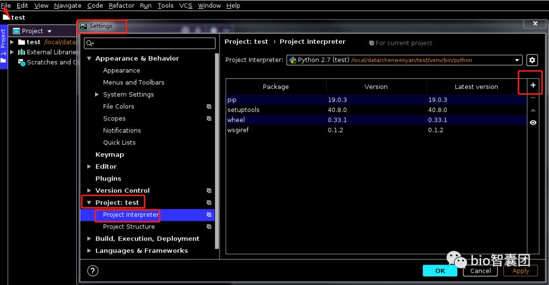 1、依次点击“file”→“settings”→“Project: test”→“Project Interpreter”