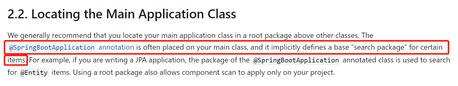 意思是:@SpringBootApplication注解通常会被我们放在主类中,它隐含为项目定义了基本的搜索包。即,Spring boot项目通常会以这个注解所在的类的包路径为根去扫描bean定义(如果我们没有另外指定时)。