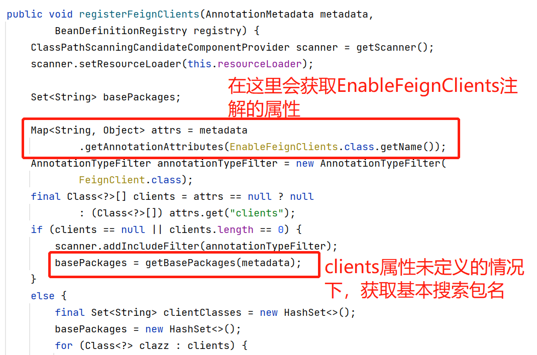 找到注册Feign客户端的方法: registerFeignClients(metadata, registry);