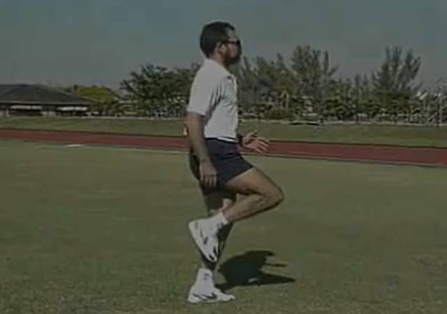 此练习难度最高,目的是发展关键跑姿所需的平衡与力量。尽量缩短触地时间,在不失去平衡下加快动作,手臂和上半身保持放松。