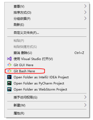 2、右键鼠标,选中 “git Bash here”,当然你也可以在windows的 “开始”--->“所以程序”,或者安装目录打开它