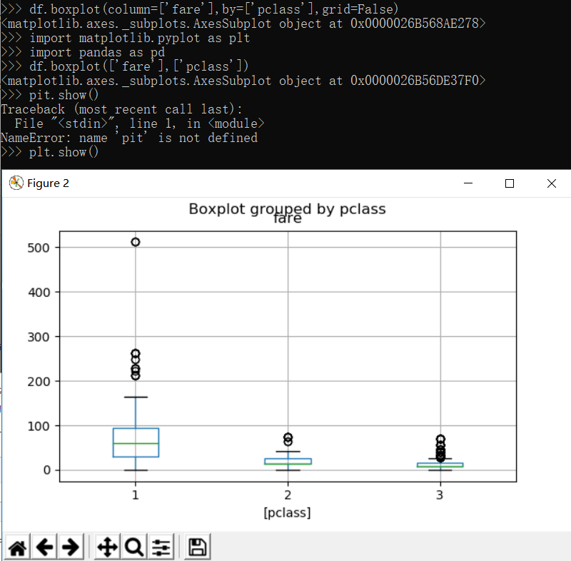 >>> df.boxplot(column=['fare'],by=['pclass'],grid=False)
