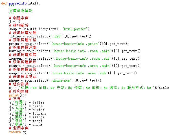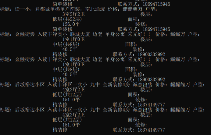 sj = '标题:%s 价格:%s 户型:%s 楼层:%s 面积:%s 装修:%s 联系方式:%s '%(titles,price,huxing,louceng,mianji,maopi,phone)