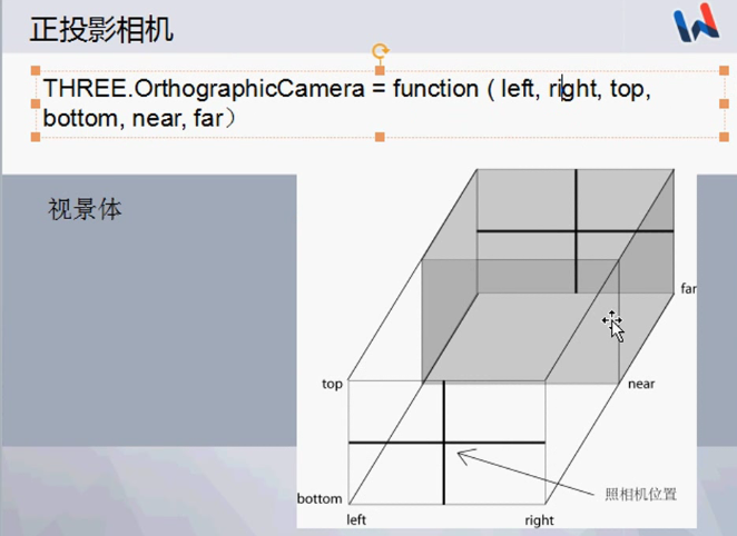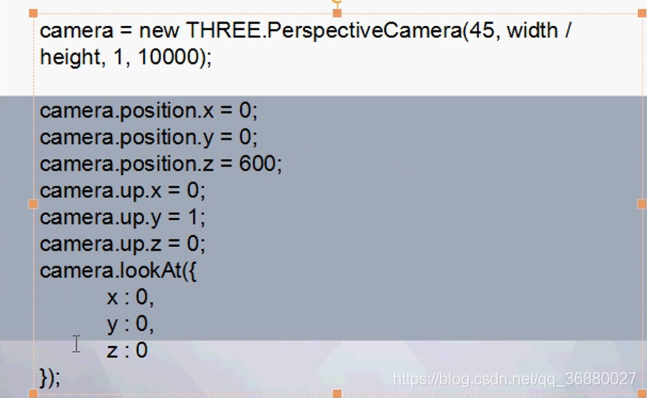 - camera.lookAt:相机焦点方向,即相机看向哪个坐标,默认为Z轴负半轴方向。如果设置了lookAt,比如: