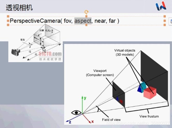 透视相机的示意图如下,可视区在near和far之间,同时aspect是长/宽的比例。