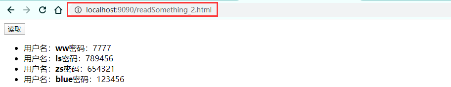 6.读取json文件,文件内容:[{user: 'blue', pass: '123456'},{user: 'zs', pass: '654321'},{user: 'ls', pass: '789456'},{user: 'ww', pass: '7777'}]