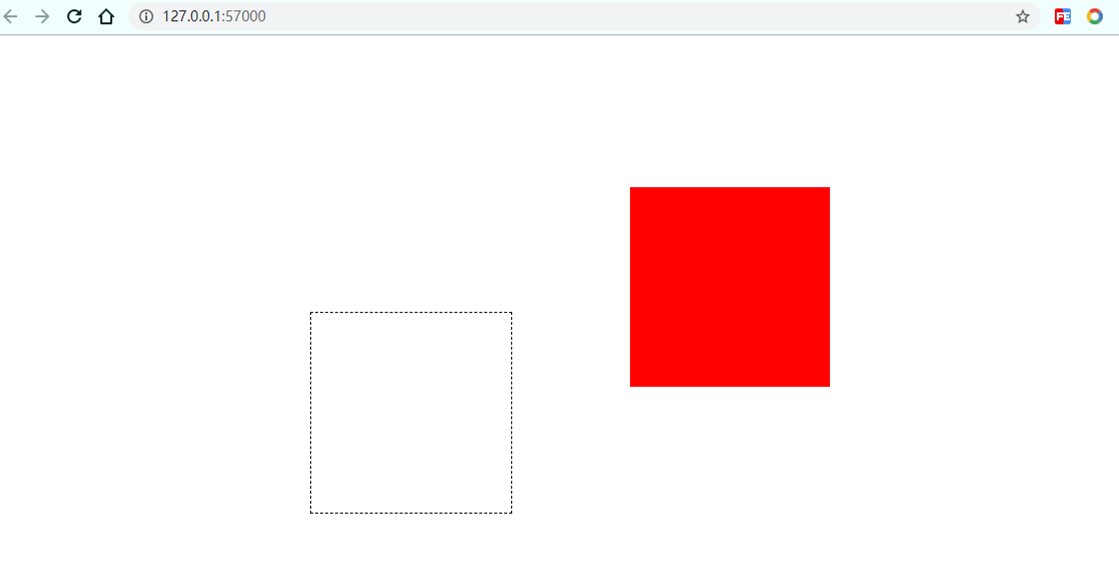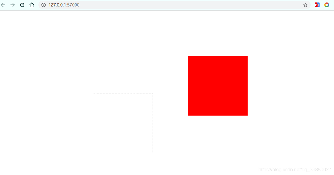 带框的拖拽,拖动红色div时,div先不移动,而是出现一个虚线框,虚线框移动到哪儿,放开鼠标后div就移动到哪儿。效果如下:
